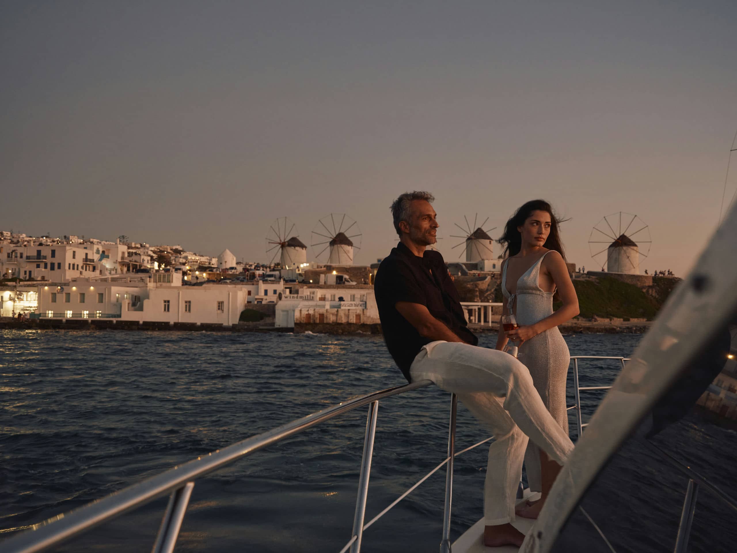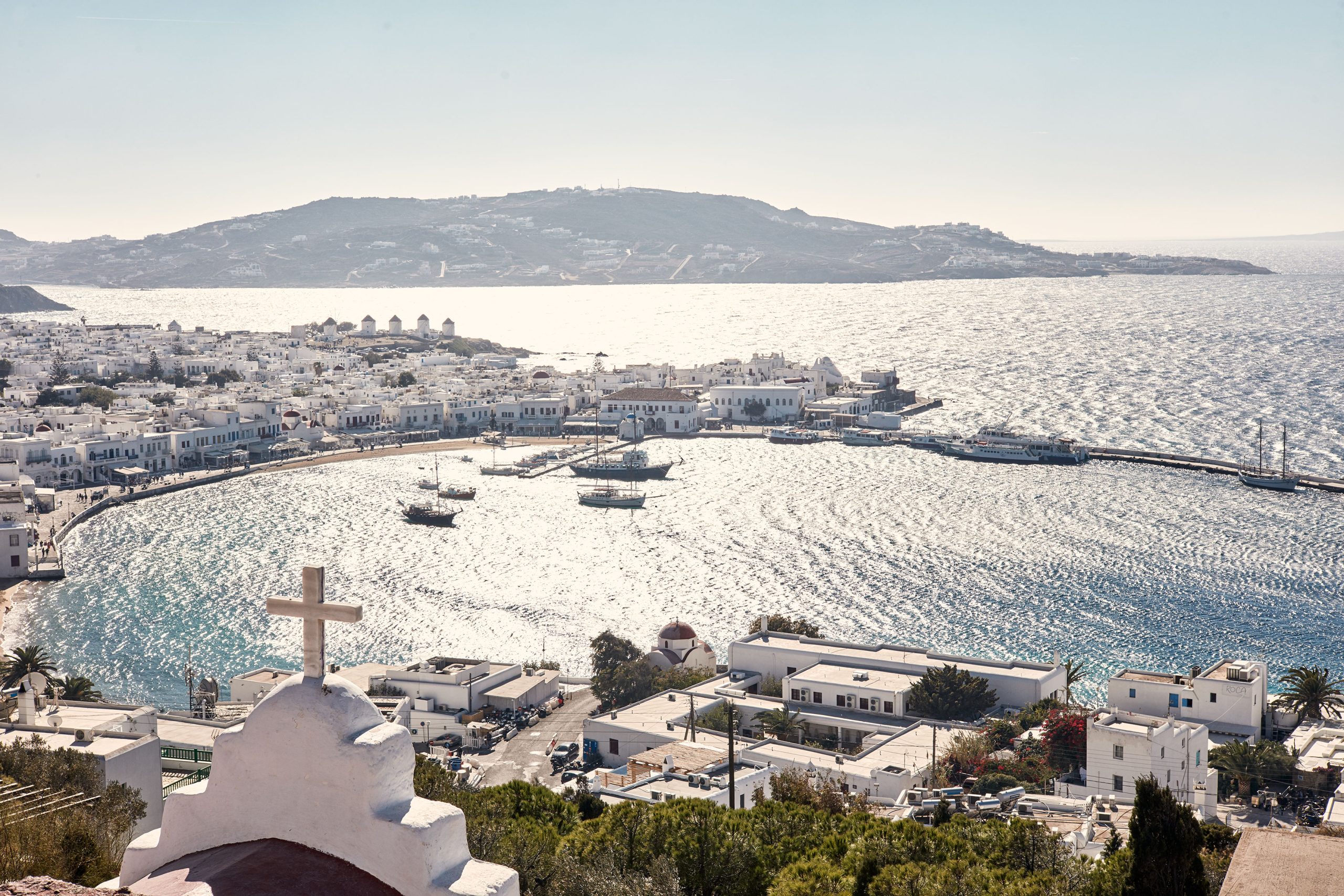 Platis Gialos Bay is just five kilometres (three miles) from Mykonos Town, known locally as Chora. Famed for its relaxed charm, historical allure, and striking Cycladic architecture, Chora is a maze of whitewashed houses and cobbled passages lined with boutiques showcasing local craftsmanship alongside international fashion. Its lively bars, clubs, and tavernas create an atmosphere that is uniquely Mykonos. A public bus runs from the beach boardwalk to Fabrica Square every half hour from 8 a.m. to 4 a.m. in peak season (July and August) or hourly in other months.
