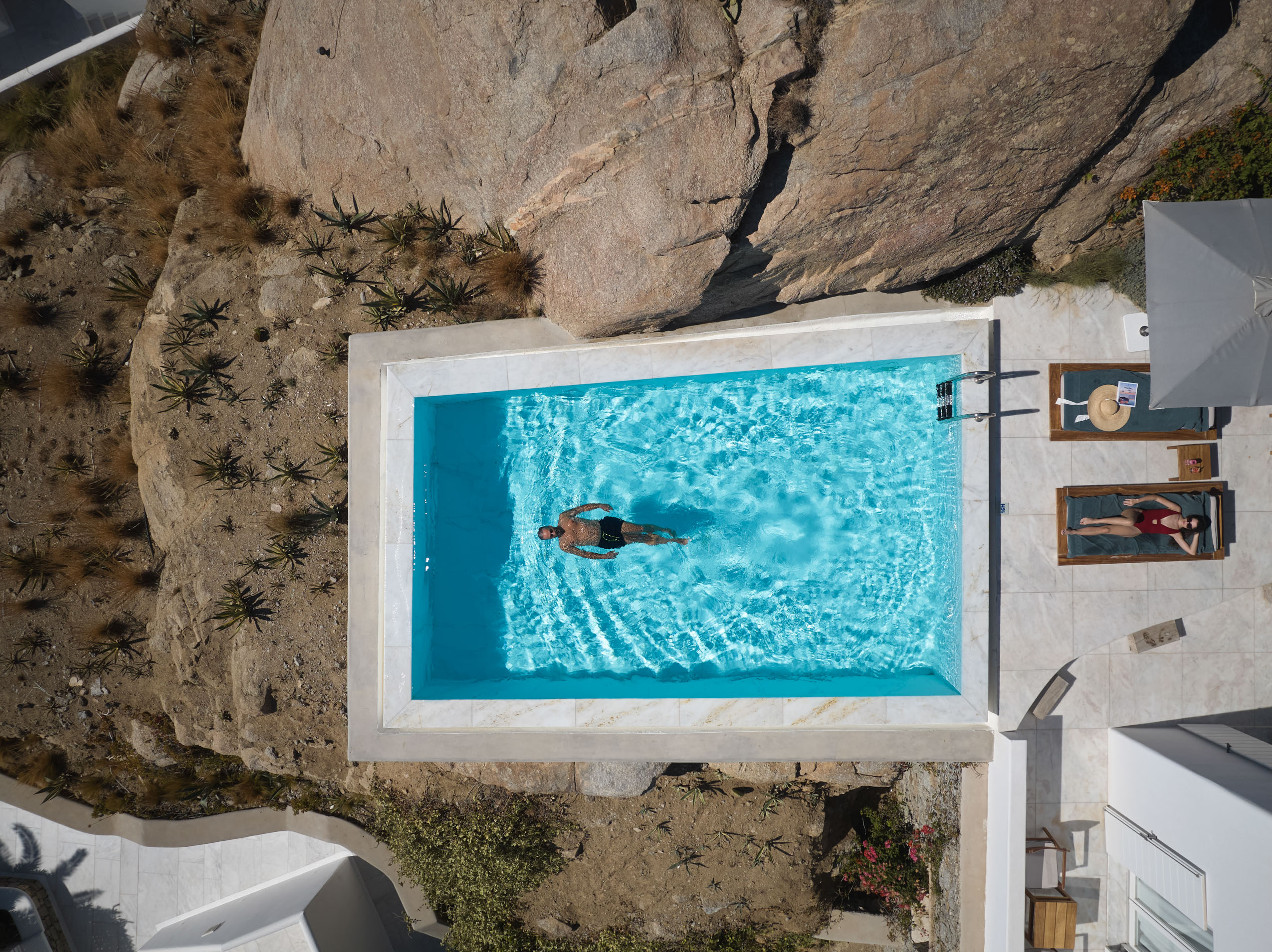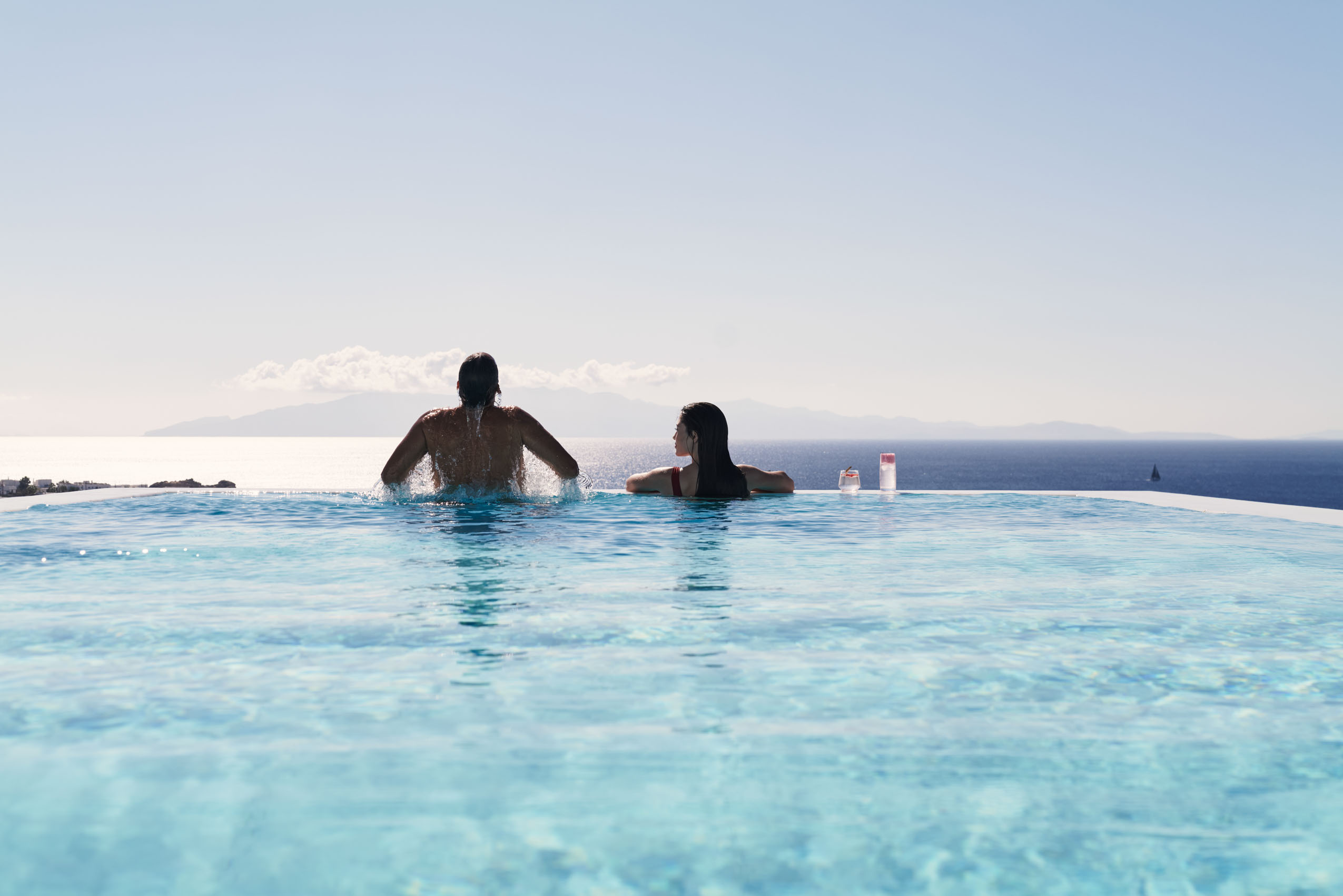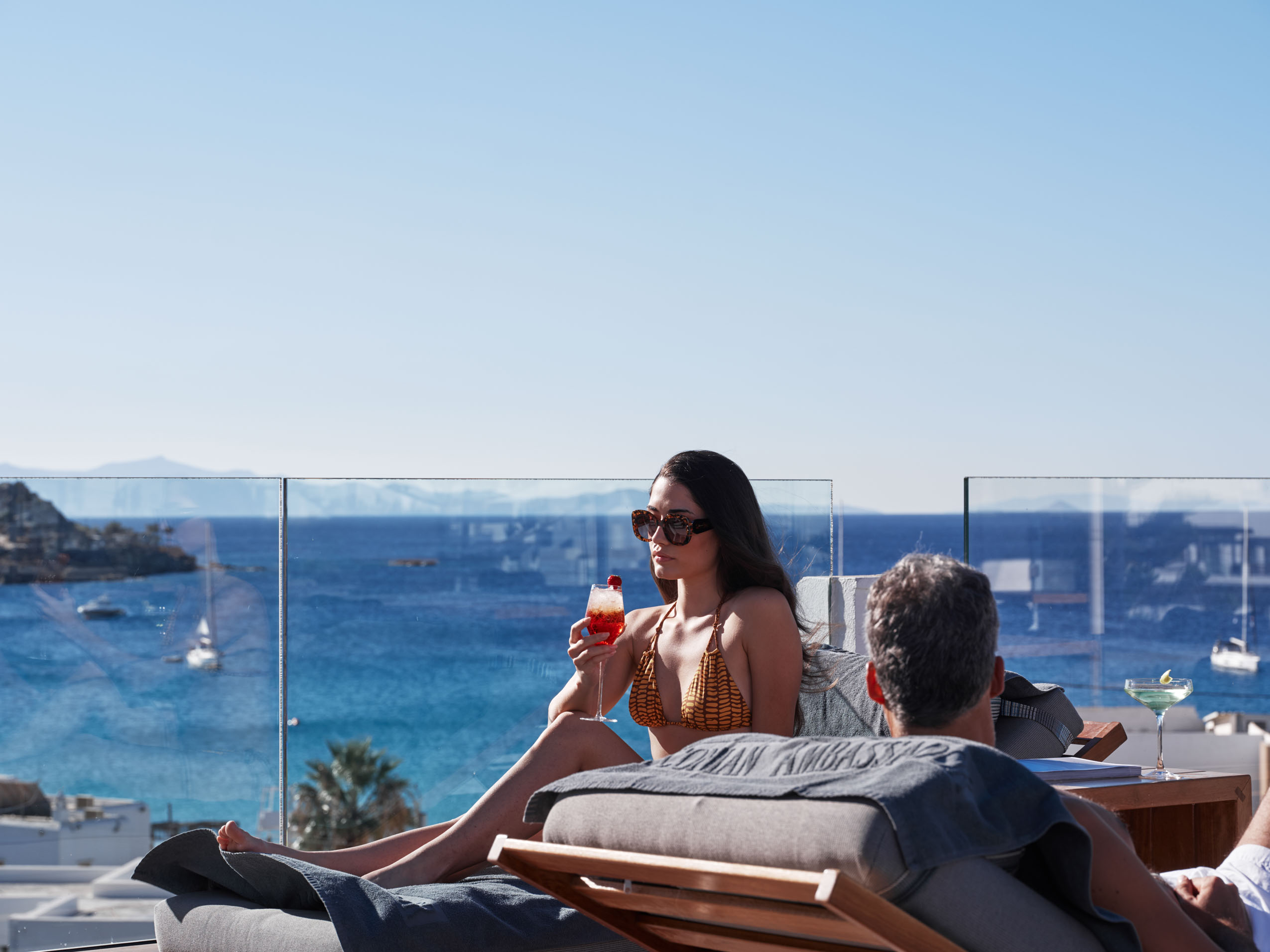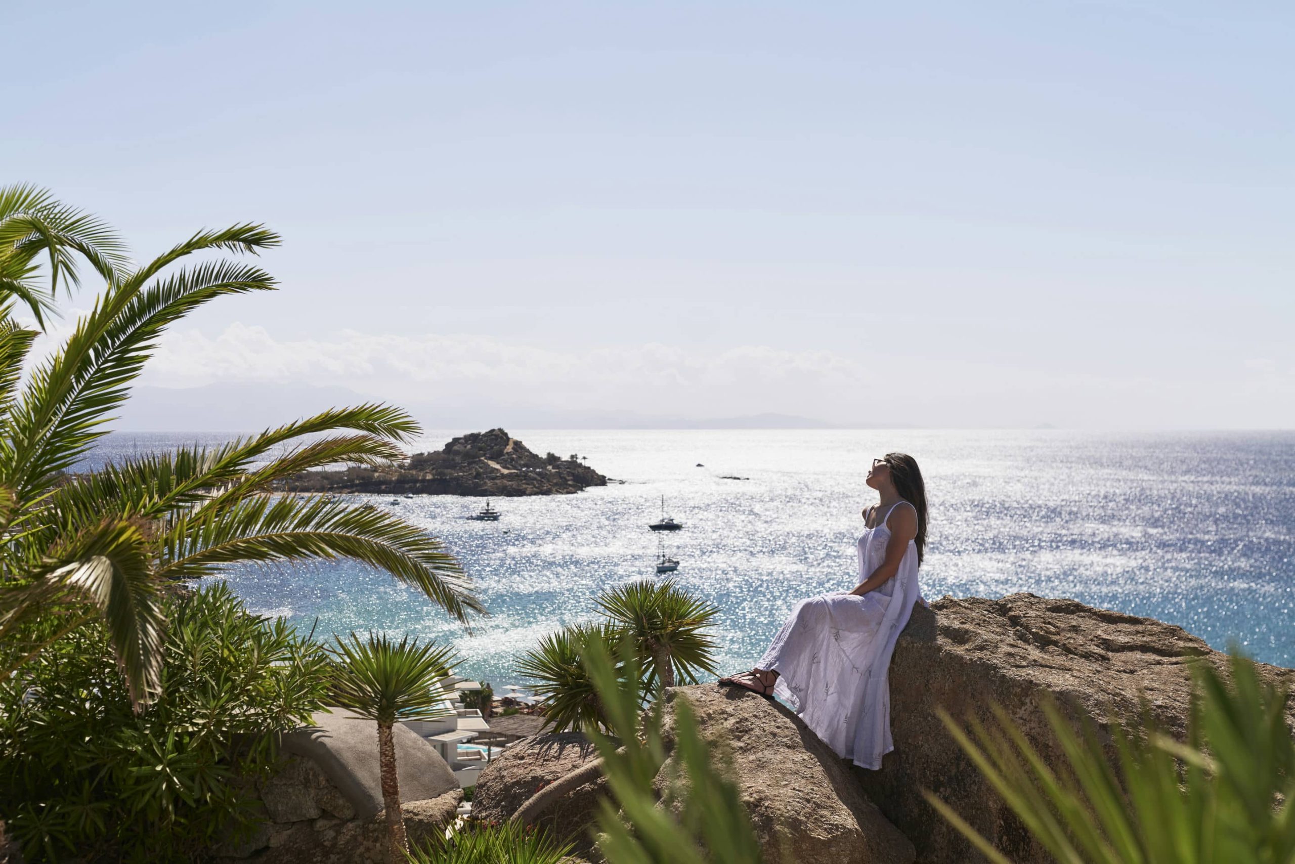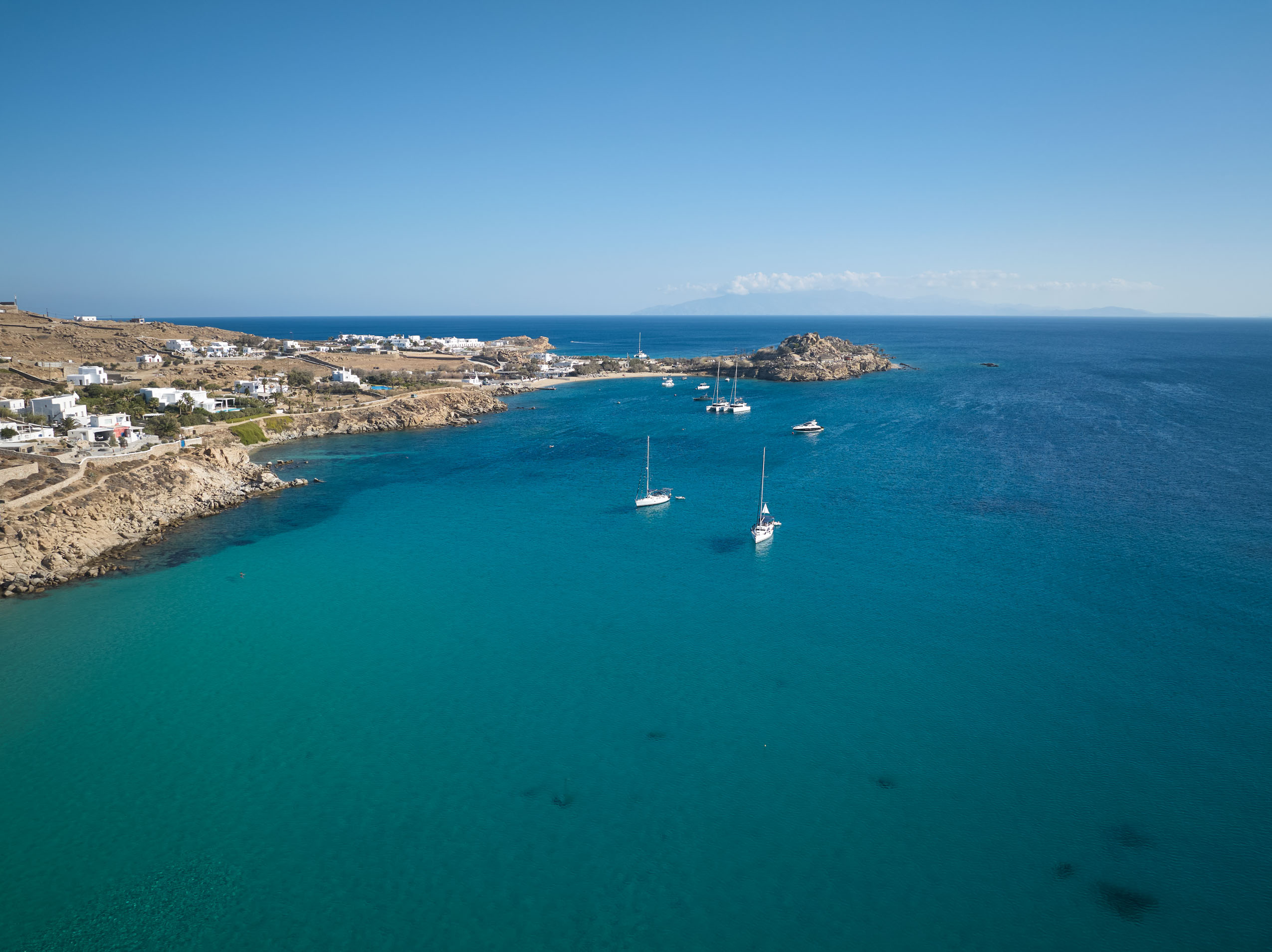 Our hotel is situated directly above this beach which is beloved for its fine sand, crystal waters, charming boutiques, and quaint restaurants along the boardwalk. Water sports organisers offer jet-ski rentals, wakeboarding, surfing, waterskiing, tube-sofa and banana-boat rides, canoeing, and snorkelling. Glass-bottom boat rides and private yacht charters depart from our jetty— our Guest Services can provide further details. A short stroll away, the beaches of glamorous Psarou, Paranga, and Agia Anna await, along with the iconic promontory where ultra-cool Scorpios holds court. Fresh beach towels are available daily at reception.