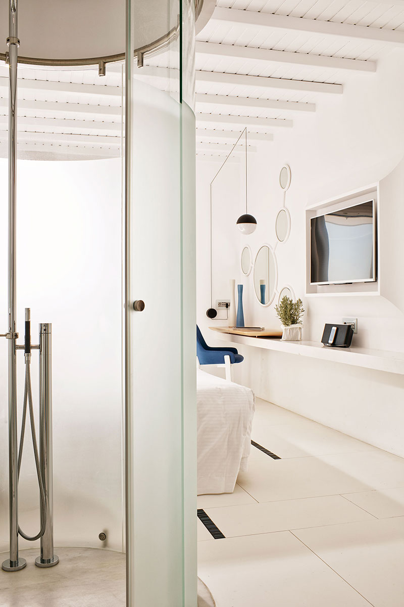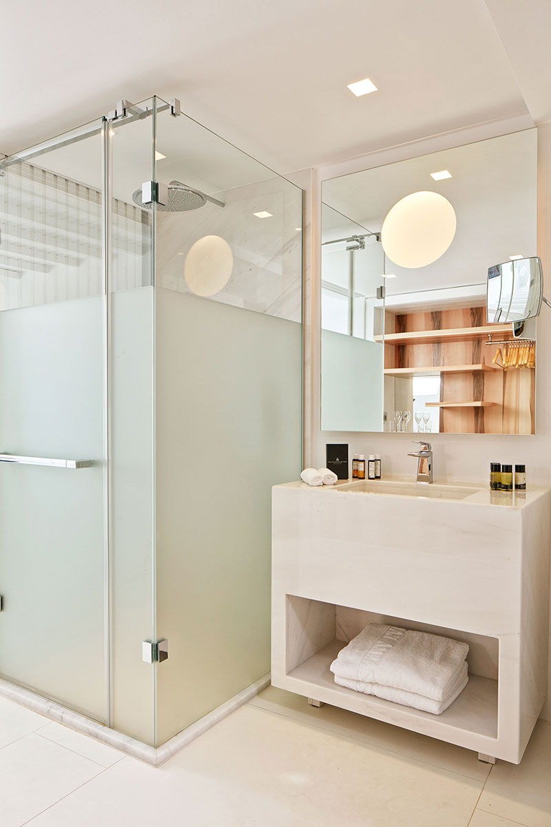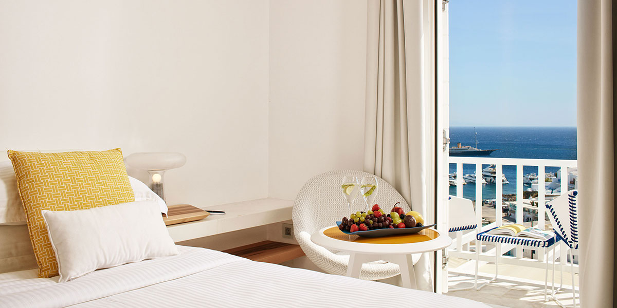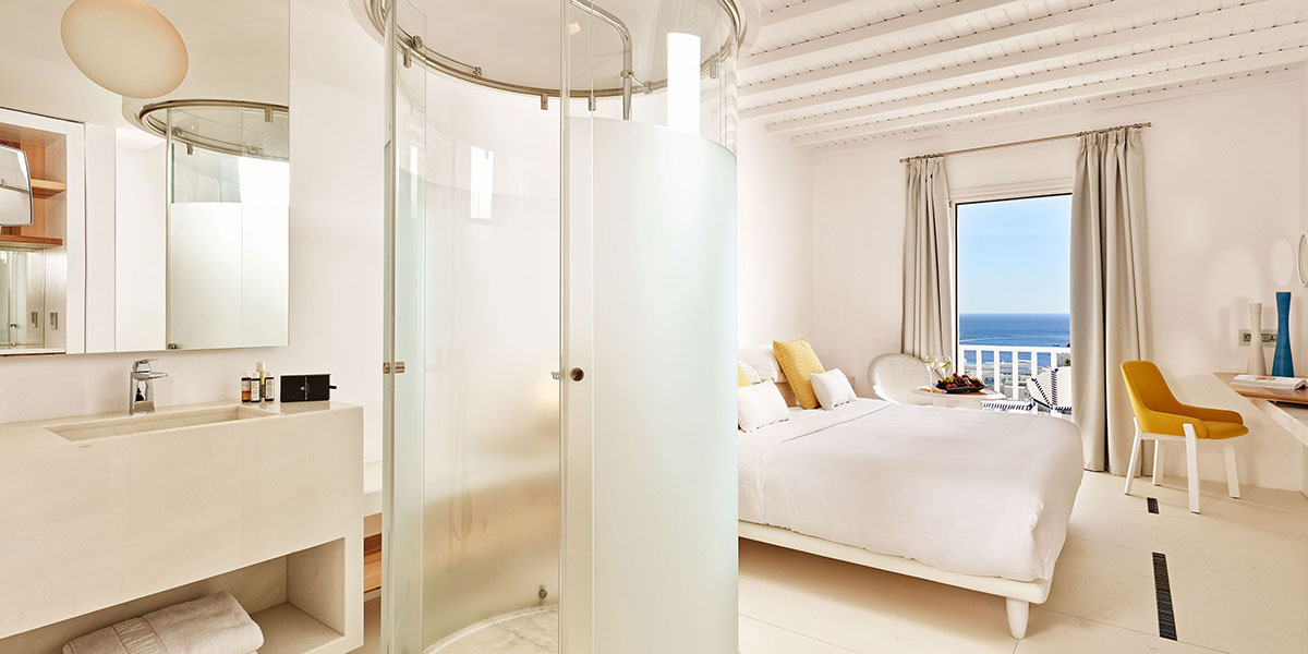 The room’s contemporary open flow extends seamlessly to a private balcony or terrace with endless views of the Aegean. Sophistication and comfort are invested in every detail: marble floors and floating shelves, walls and crisp linens all play to the power of