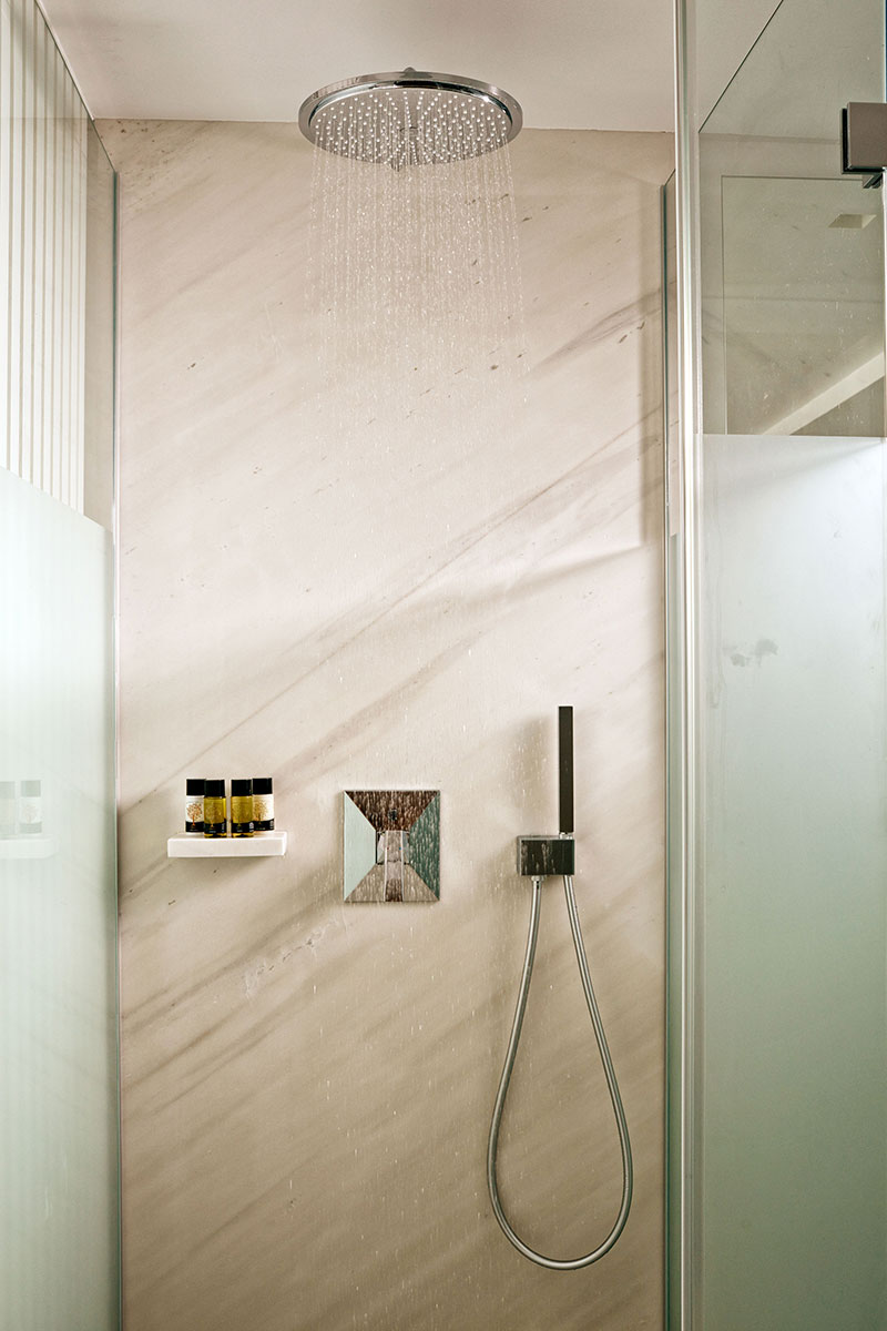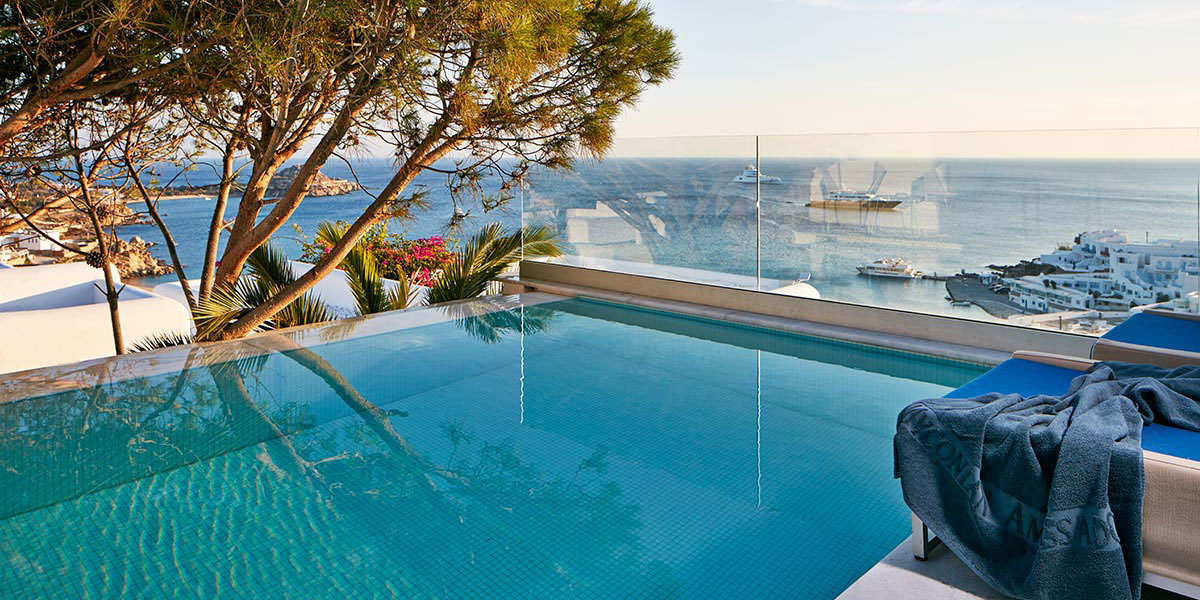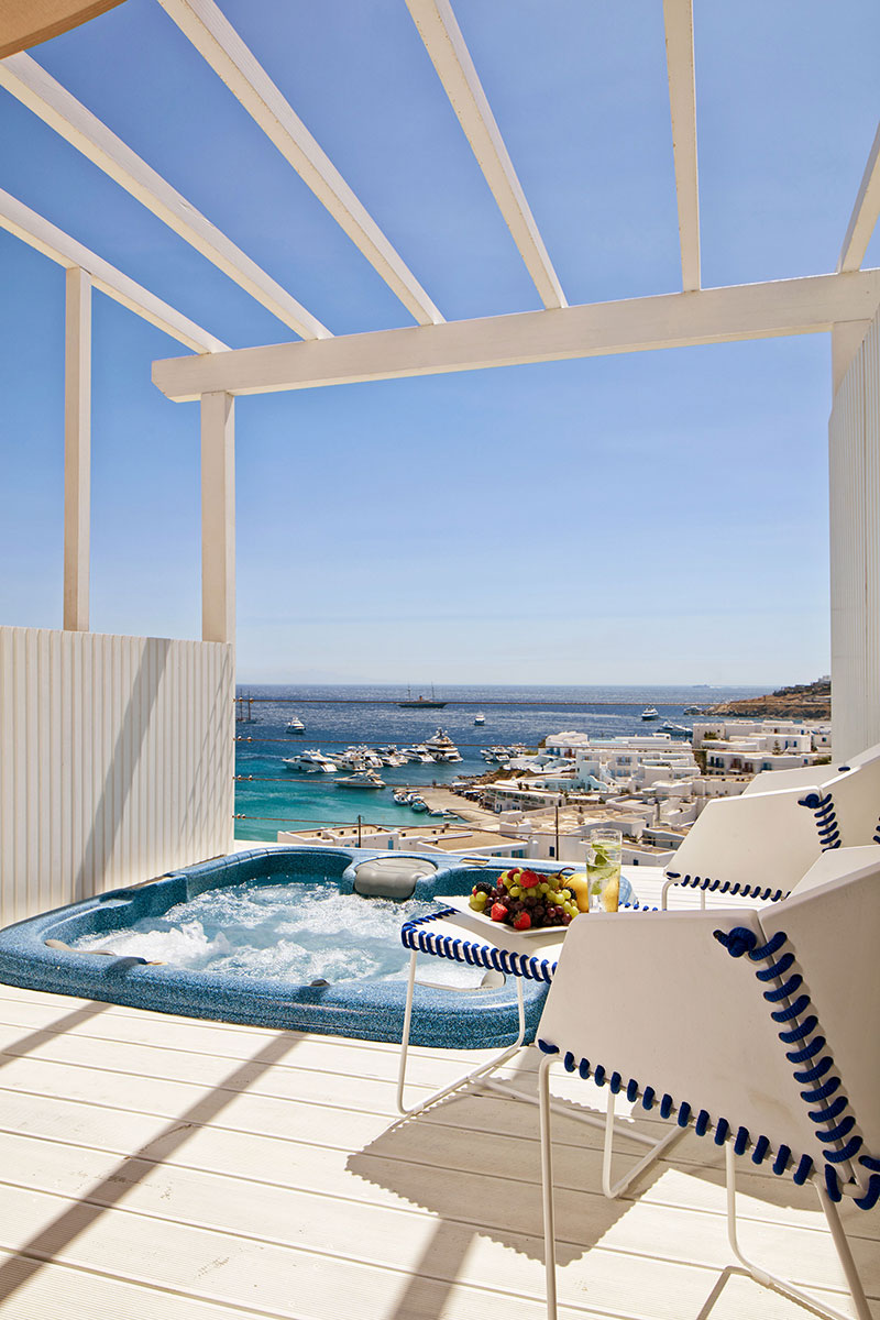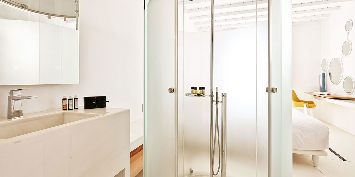 The room’s contemporary open flow extends seamlessly to a private balcony or terrace with endless views of the Aegean. Sophistication and comfort are invested in every detail: marble floors and floating shelves, walls and crisp linens all play to the power of