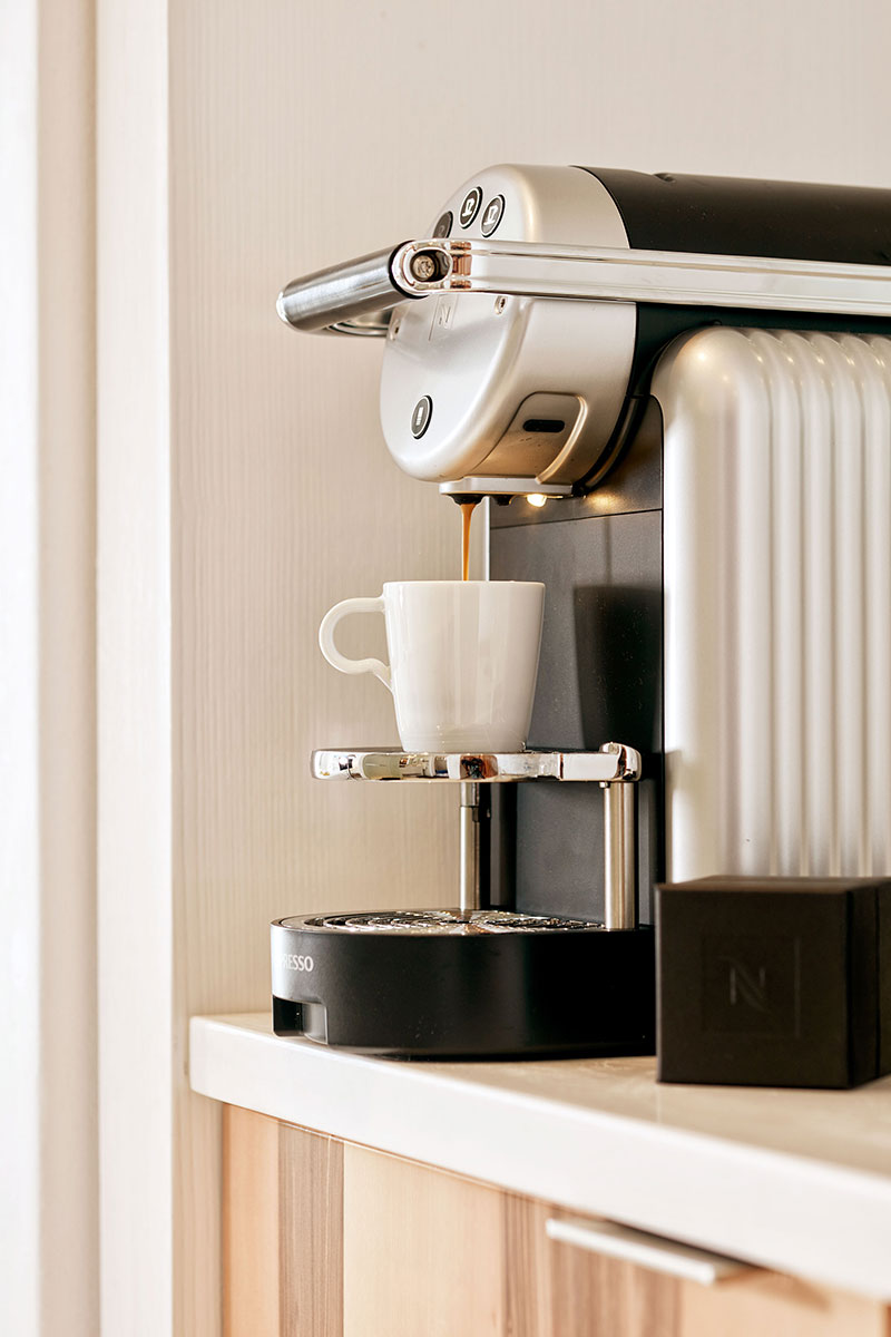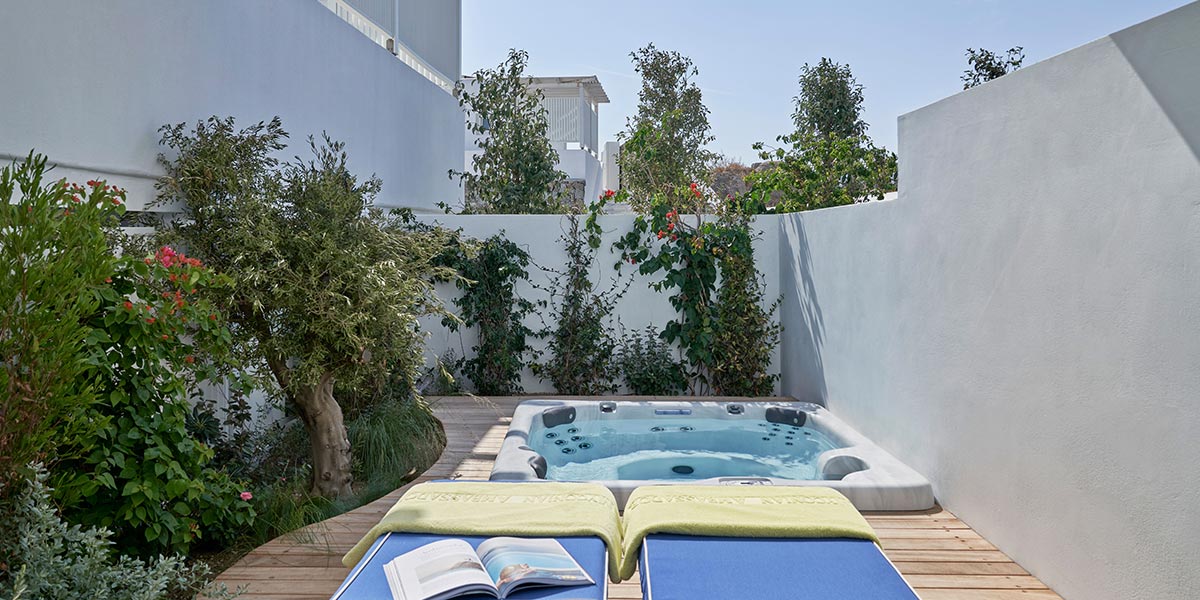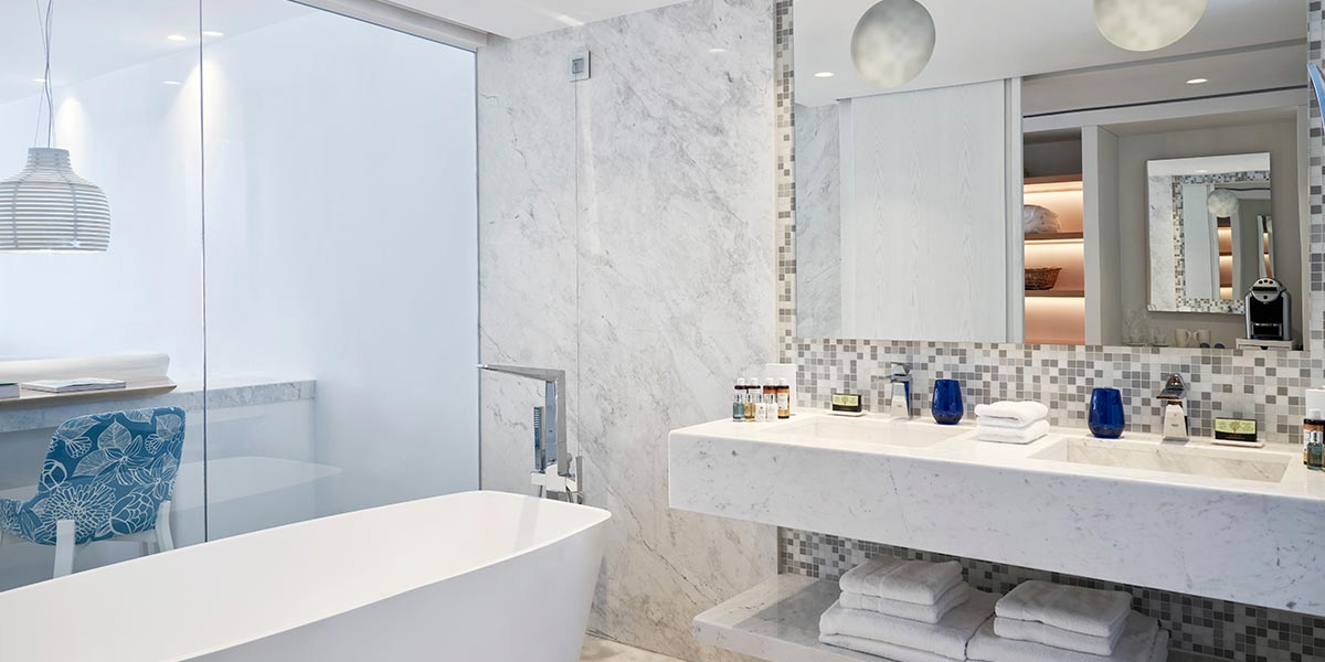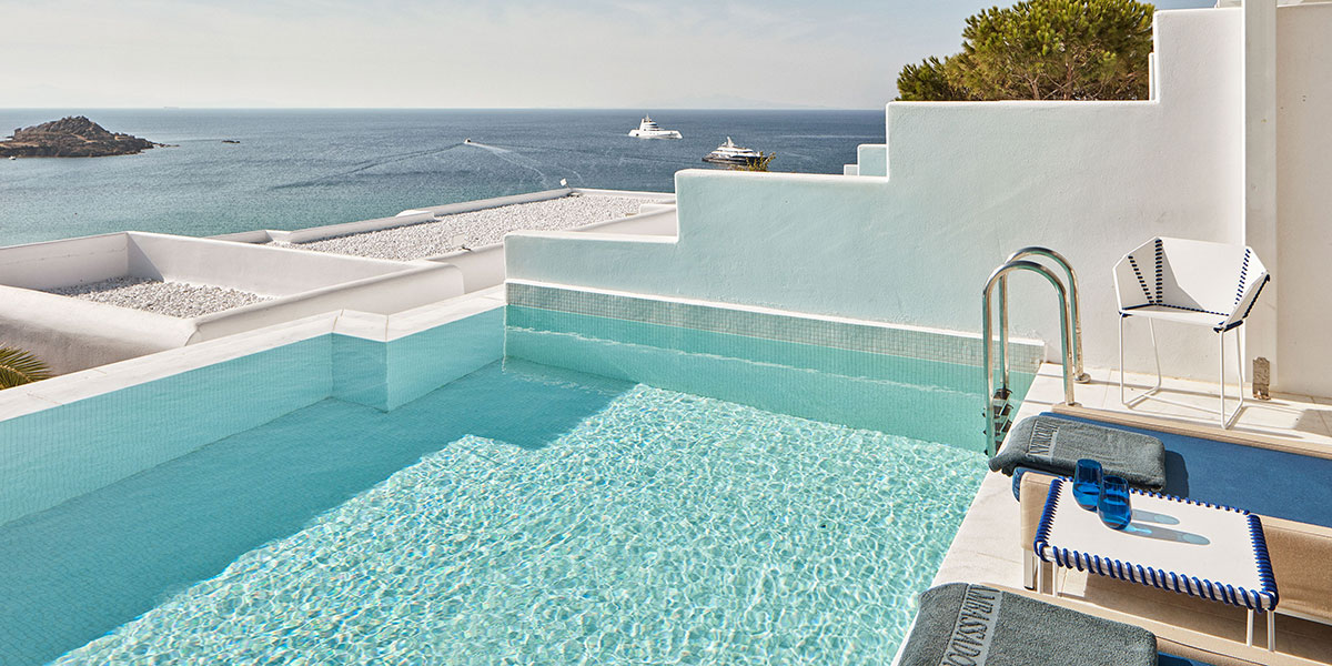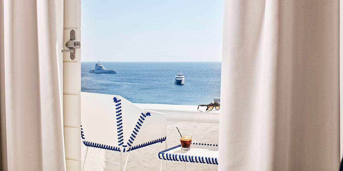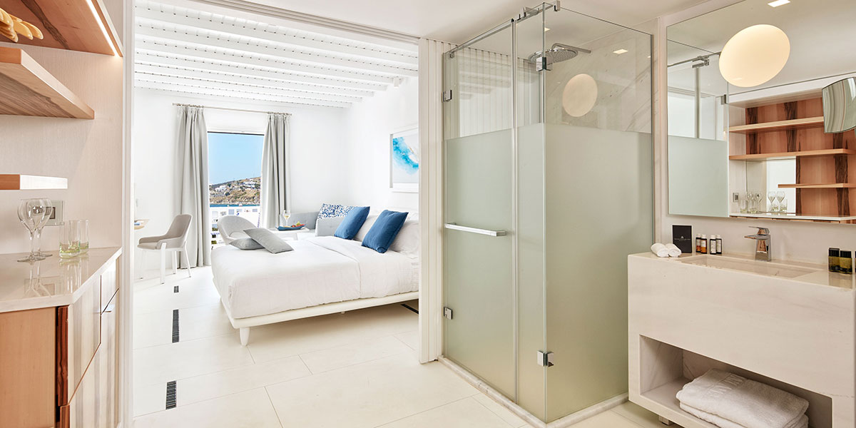 The elegance of this spacious open flow extends from the interiors to a private balcony or terrace with captivating views of the Aegean. Every detail reflects luxury and comfort: marble floors and floating shelves, as well as crisp linens highlight the purity of white, enriched by key notes of classic blue, warm wood accents, and perfect mood lighting. A Flos designer fixture, reminiscent of a floating moon is suspended over the desk, while bespoke bedside lights add a soft, inviting glow. It’s a serene retreat from the vibrant energy of the island that offers a perfect blend of quiet intimacy and indulgence.