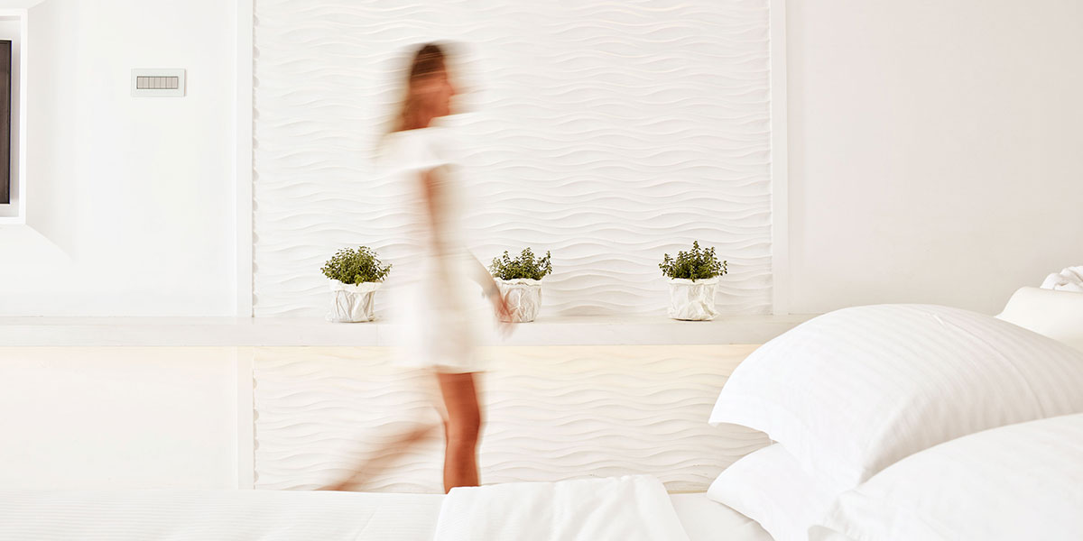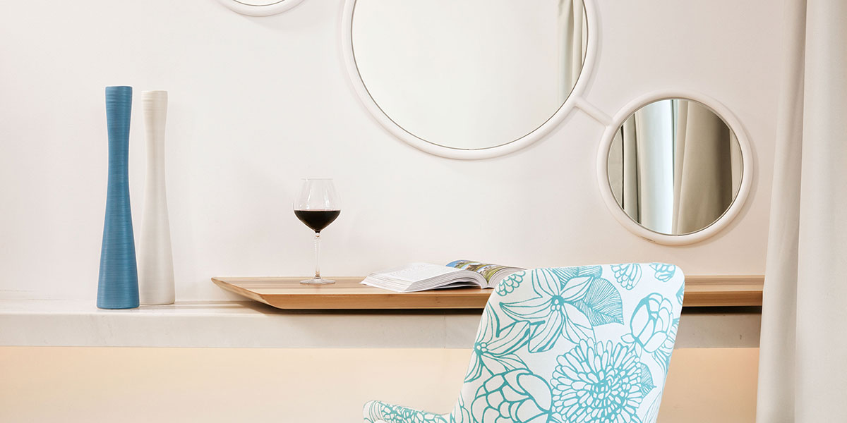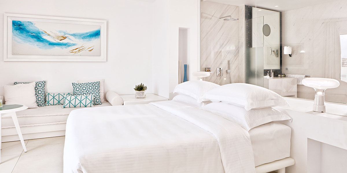 The Azure suites are spacious all-white oases accented with classic blue that echo the aquamarine pool below, merging with the expanse of sea stretching to the horizon. Enjoy this unique view from the loungers and private Jacuzzi of the broad outdoor terrace, or even from your bed while drifting into mid-afternoon siestas. This exceptional suite with a shower and freestanding feature bath, king-size or twin beds, and a seating area with a sofa bed, comfortably accommodates up to 3 people.