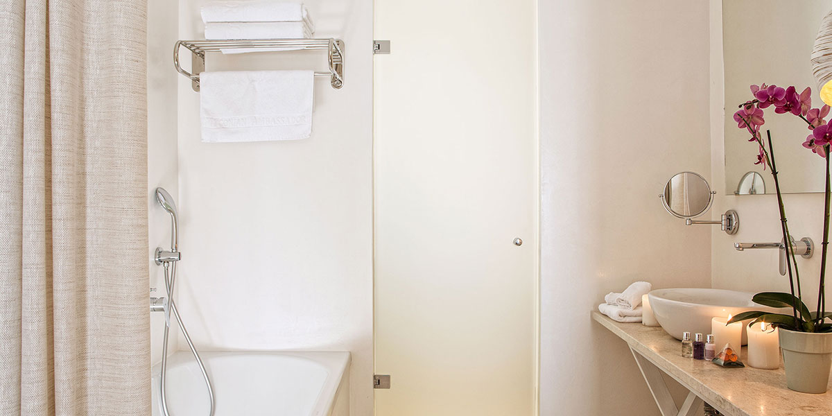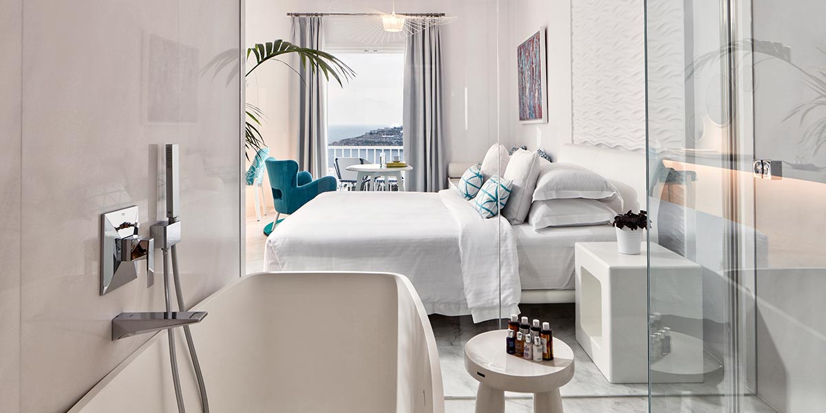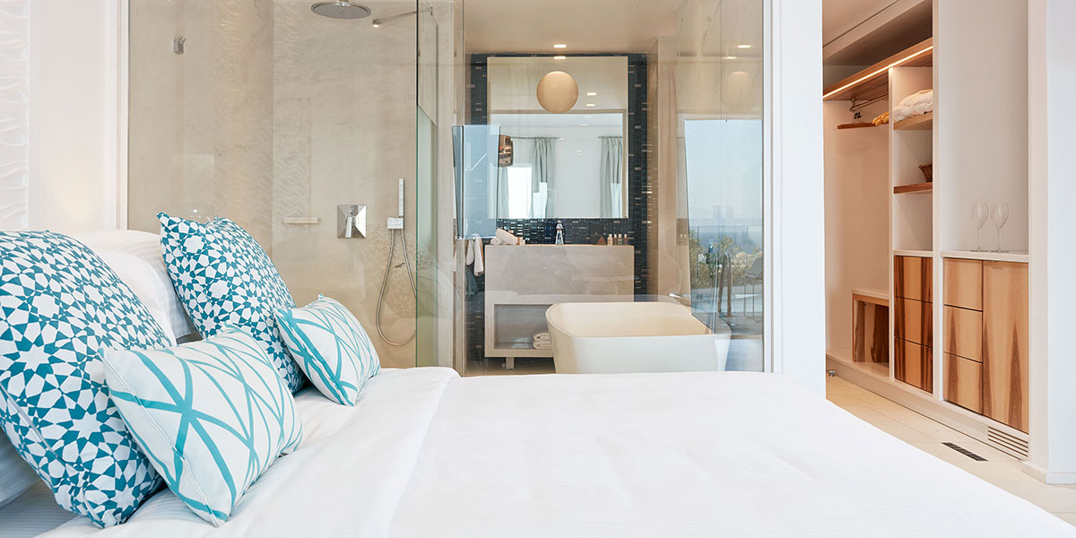 This luxurious suite expands from a spacious suite to a private terrace with sweeping views of the Aegean. Every detail exudes a blend of simplicity and sophistication: marble floors and floating shelves, smooth walls and crisp linens all highlight the beauty of pure white, while accents in classic blue are softened by wood accents and superb mood lighting. The bathroom is a haven of pure indulgence, featuring a deep bath, rain shower,