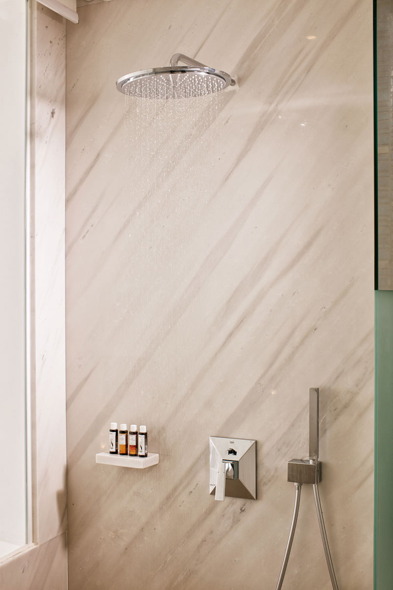 and luxury cosmetics. A Flos designer fixture, like a floating moon, graces the desk, while custom bedside lights add a warm glow. Coming from the vibrant outdoors, this serene retreat offers an oasis of quiet intimacy and refined indulgence.