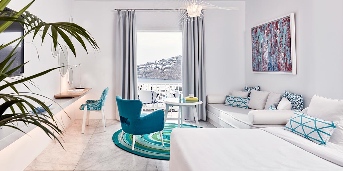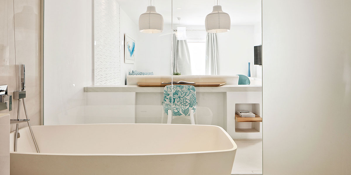 The Thalassa suites are available in four different types: balcony or terrace with sea view and seating; terrace with shared pool; terrace with private pool. Also available with a shared/private pool.
